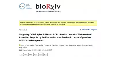Eine 2020 an der Blacksea University durchgeführte Forschung untersuchte die hemmende Wirkung von anatolischer Propolis gegen SARS-Coronavirus-2 (SARS-CoV-2) in vitro und in silico. Propolisproben waren reich an Kaffeesäure, p-Cumarinsäure, Ferulasäure, t-Zimtsäure, Hesperetin, Chrysin, Pinocembrin und Kaffeesäurephenethylester (CAPE). Die ethanolischen Propolis-Extrakte wurden in einer In-vitro-Studie gegen das Spike-S1-Protein (SARS-CoV-2): ACE-2-Interaktion getestet. Die mit einer molekularen Docking-Studie berechneten Bindungsenergiewerte dieser Polyphenole an den SARS-CoV-2-Spike und das ACE-2-Protein zeigten, dass Pinocembrin in beiden Rezeptoren am höchsten war, gefolgt von Chrysin, CAPE und Hesperetin. Basierend auf der In-silico-Modellierung und dem ADME-Verhalten (Absorption, Verteilung, Metabolismus und Ausscheidung) der acht Polyphenole wurde die potenzielle Fähigkeit von Propolis, als neuartiges Medikament effektiv zu wirken, demonstriert. Die Autoren schlugen vor, dass Propolis ein hohes Hemmpotential gegen das Covid-19-Virus hat.* *Guler, H.I., Fulya, A.Y., Zehra, C.A.N., Yakup, K.A.R.A., Belduz, A.O., Canakci, S. und Kolayli, S., 2021. Targeting CoV-2 Spike RBD and ACE-2 Interaction with Flavonoids of Anatolian Propolis by in silico und in vitro Studien zu möglichen COVID-19 Therapeutika.2021. Türk J. Biol. 45: 530-548. doi:10.3906/biy-2104-5.