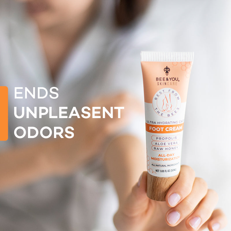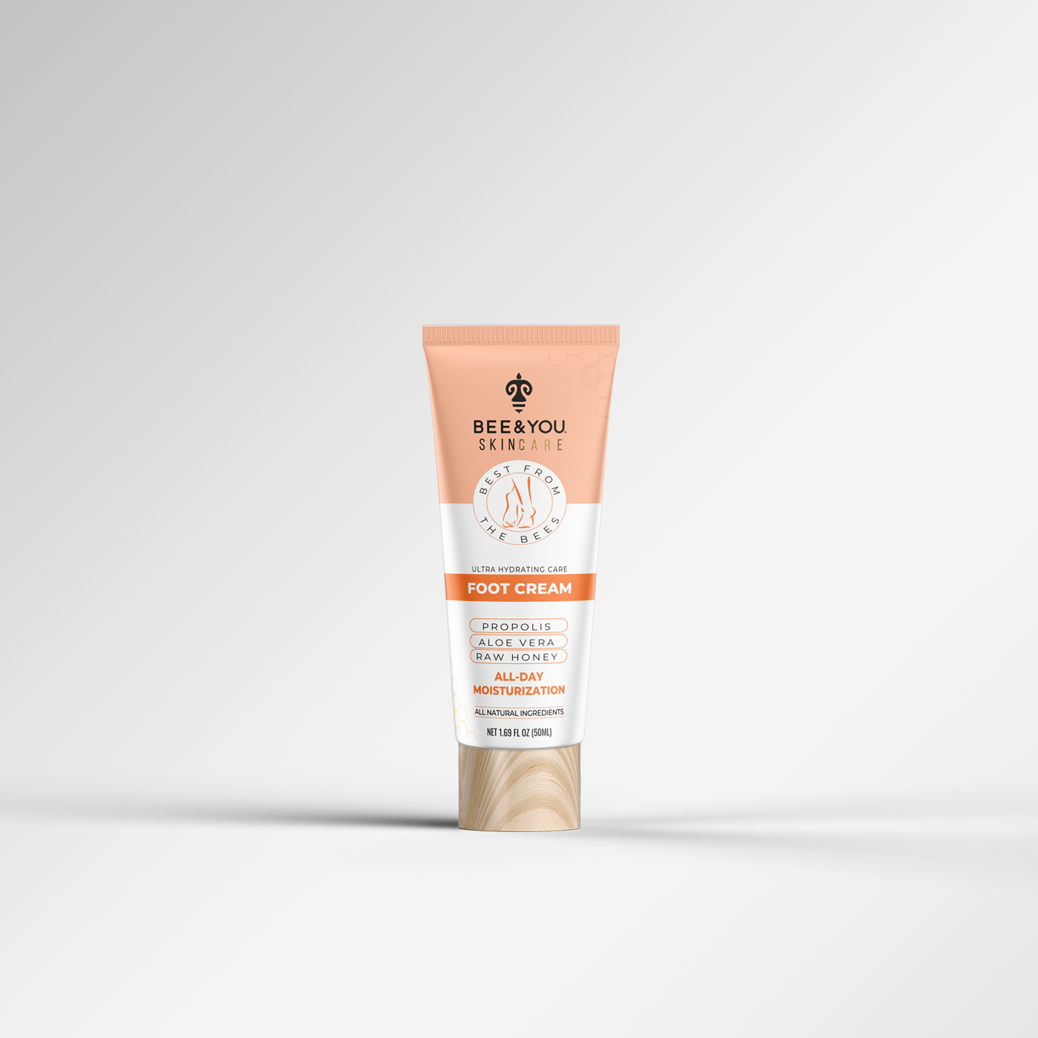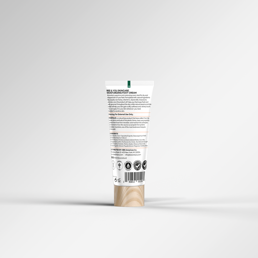 BEE&YOU Natuurlijke hydraterende voetcrème wordt voornamelijk gemaakt met karitéboter, sesamzaadolie, vit B5, zinkoxide, aloë vera, glycerine aqua, Anatolisch propolis-extract en rauwe honing. Geweldige formule voor droge en gebarsten voeten! Beëindigt onaangename geuren, schilferende huid en pijn met Anatolische bijenpropolis!