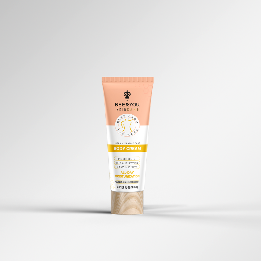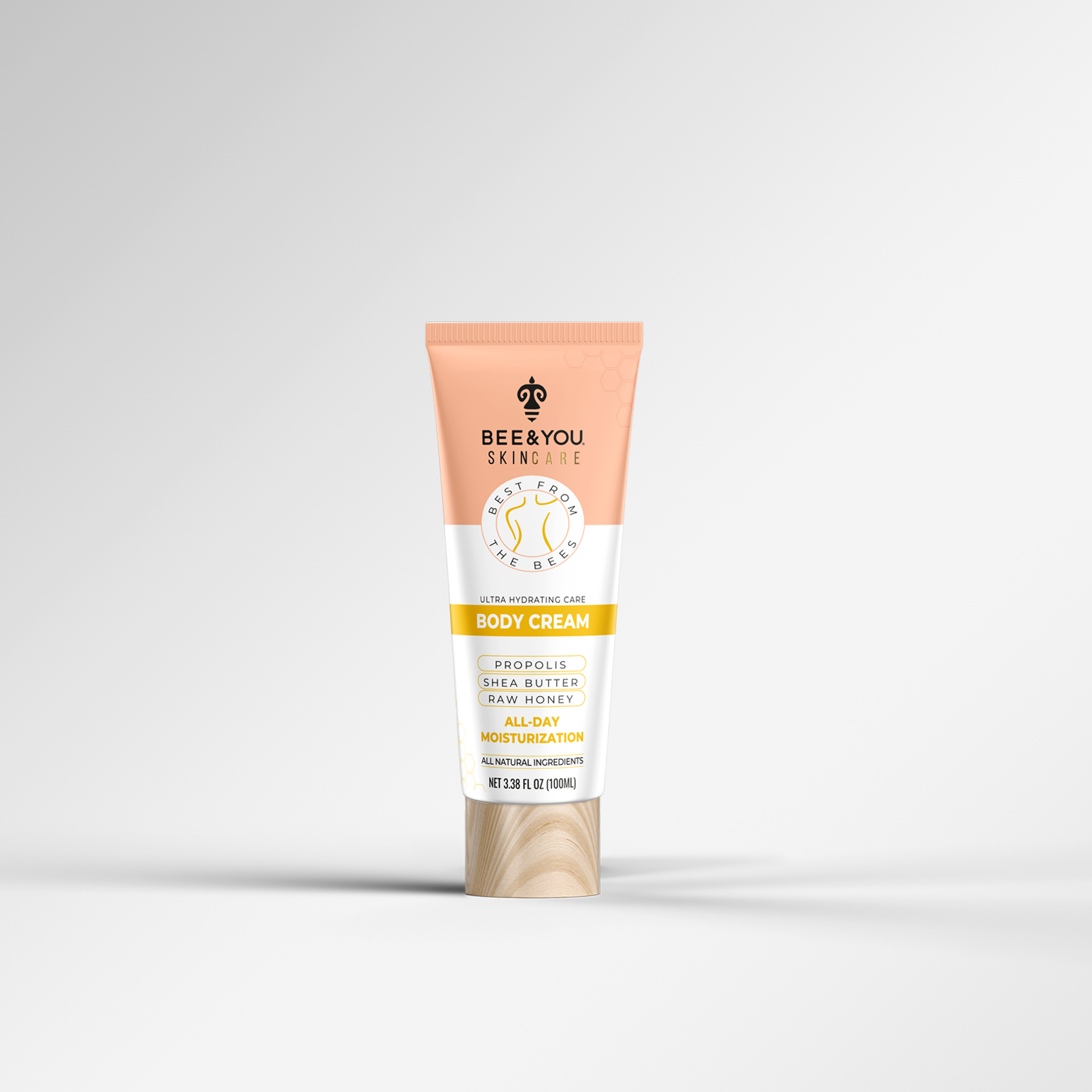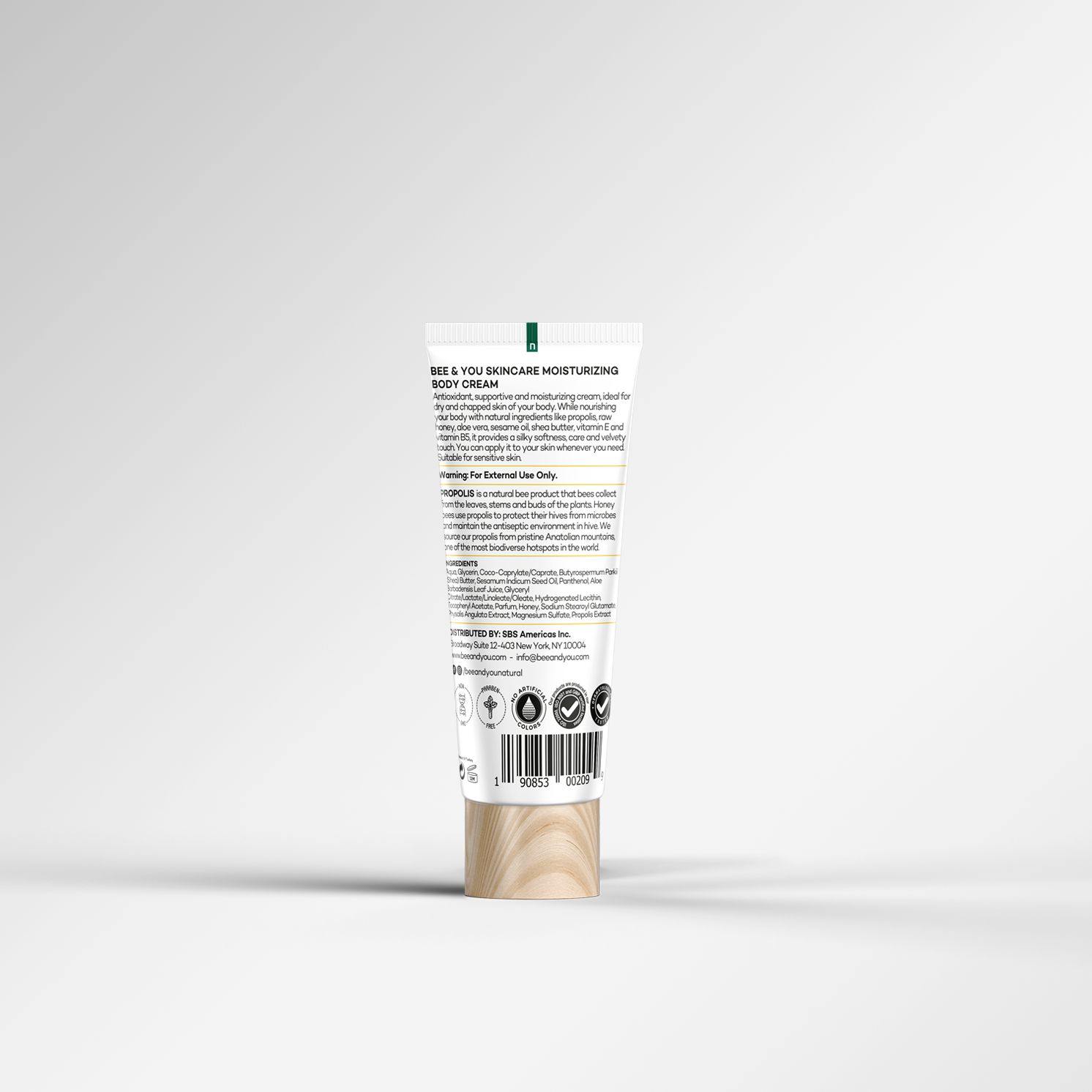 BEE&YOU Naturalny nawilżający krem do ciała składa się głównie z masła shea, witaminy B5, oleju sezamowego, oleju arganowego, wody glicerynowej, ekstraktu z propolisu anatolijskiego i surowego miodu. Całkowicie naturalna formuła pomaga w równoważeniu, gojeniu i łagodzeniu problematycznej skóry. Bogaty w przeciwutleniacze ekstrakt z propolisu i ekstrakty ziołowe chronią skórę i zapewniają jej witalność i młodość. Ultraodżywczy i szybko wchłaniany przez organizm.